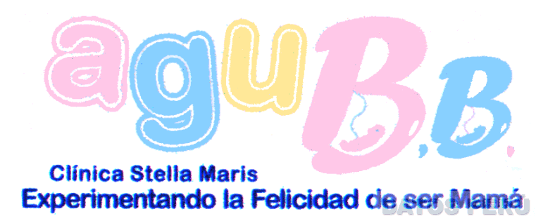 El logotipo conformado por la denominación AGUBB escrita en letras características, en la combinación de colores rosado, celeste y amarillo; donde las letras B contienen unas figuras características; y en la parte inferior la frase CLINICA STELLA MARIS EXPERIMENTANDO LA FELICIDAD DE SER MAMA, en color azul; conforme al modelo adjunto