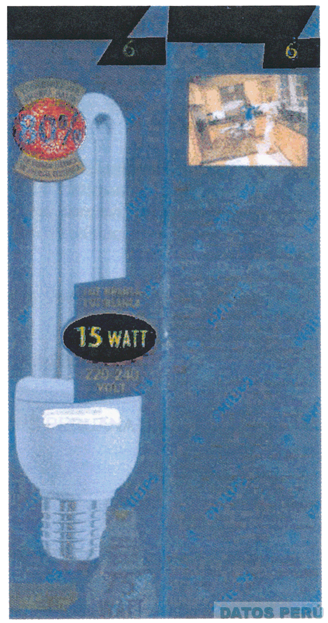 La etiqueta rectangular de color azul metálico con la figura de un foco ahorrador al lado izquierdo, en la parte superior se observa dos franjas de color negro, en la parte superior derecha se observa la figura de una habitación con dos personas, sobre la parte superior del foco se observa un círculo rojo con franja amarilla superior e inferior en el que se observa la denominación AHORRA HASTA 80% DE ENERGIA ELÉCTRICA (sin reivindicar), sobre la parte derecha inferior del foco se observa la denominación 15 WATT (sin reivindicar) en letras amarillas sobre un fondo negro; conforme al modelo adjunto