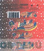 La etiqueta conformada por las denominaciones AINHOA, YOGURT FRESA y UNA TRAVESURA DE SABOR, escrita en letras características, el diseño estilizado de un personaje extraterrestre, el cual tiene un triángulo en la frente y en la parte central del pelo, y que sostiene entre sus manos un arco iris, al costado se aprecia la figura de una galleta rellena y debajo de éstas, líneas onduladas de varios colores, así como la figura de varias estrellas distribuidas por toda la etiqueta, todo en la combinación de colores morado, azul, verde, amarillo, rojo oscuro, rojo claro, marrón claro, rosado, blanco y anaranjado; conforme al modelo adjunto
