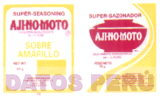 LA ENVOLTURA DIVIDIDA EN UN CAMPO DERECHO COLOR TRANSPARENTE Y AMARILLO, AMBOS COLORES SEPARADOS POR UNA CURVA Y LA DENOMINACION AJI-NO-MOTO EN COLOR TRANSPARENTE ESCRITA SOBRE LA FIGURA DE UN TAZON COLOR ROJO CON LEYENDAS EN COLOR ROJO, EL CAMPO IZQUIERDO DE FONDO COLOR TRANSPARENTE, CON BORDE AMARILLO, CONTENIENDO LA DENOMINACION AJI-NO-MOTO Y OTRAS LEYENDAS EN COLOR ROJO, EN EL CENTRO SE LEE SOBRE AMARILLO EN LETRAS AMARILLAS, CONFORME AL MODELO ADJUNTO,