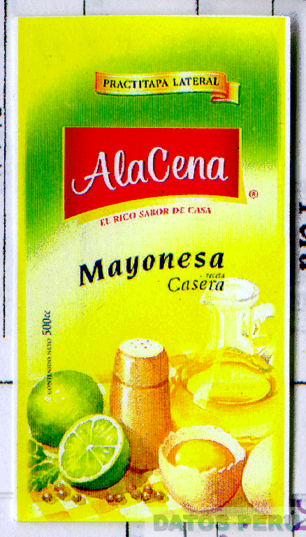 LA ETIQUETA RECTANGULAR CONSTITUIDA POR LA DENOMINACION ALACENA EN LETRAS BLANCAS DENTRO DE UN RECTANGULO COLOR ROJO SEGUIDA DE LAS FRASES EL RICO SABOR DE CASA, Y MAYONESA RECETA CASERA EN LETRAS CARACTERISTICAS, EN LA PARTE INFERIOR SOBRESALE LAS FIGURAS DE UN LIMON Y UN HUEVO PARTIDO, UN SALERO Y UN POMO DE ACEITE EN LA COMBINACION DE COLORES VERDE, CREMA, AZUL, AMARILLO Y ROJO, CONFORME AL MODELO ADJUNTO,