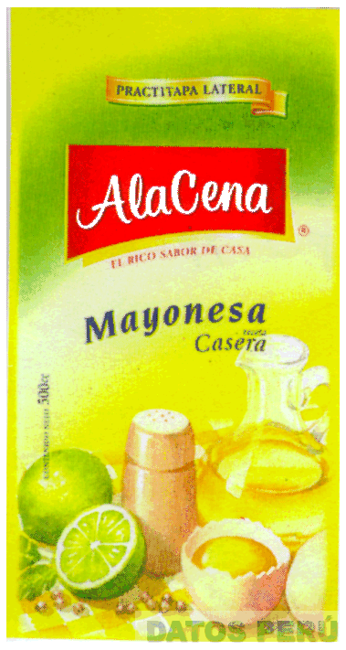 LA ETIQUETA RECTANGULAR CONSTITUIDA POR LA DENOMINACION ALACENA EN LETRAS BLANCAS DENTRO DE UN RECTANGULO COLOR ROJO SEGUIDA DE LAS FRASES EL RICO SABOR DE CASA, Y MAYONESA RECETA CASERA EN LETRAS CARACTERISTICAS, EN LA PARTE INFERIOR SOBRESALE LAS FIGURAS DE UN LIMON Y UN HUEVO PARTIDO, UN SALERO Y UN POMO DE ACEITE EN LA COMBINACION DE COLORES VERDE, CREMA, AZUL, AMARILLO Y ROJO, CONFORME AL MODELO
