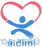 El logotipo constituido por la denominación ALDIMI escrita en letras características y la representación estilizada de una persona sujetando un corazón en forma de lazo, en la combinación de colores rojo (CMyK0,100,100,0) y azul (CMyK 69,30,0,26); conforme al modelo adjunto