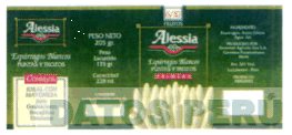 LA ETIQUETA CONSTITUIDA POR LA DENOMINACION ALESSIA ESCRITA EN FORMA CARACTERISTICA SOBRE LA IMAGEN DE UNA FIGURA IRREGULAR EN LOS COLORES BLANCO, ROJO Y VERDE Y CIRCUNDADA POR UNA LINEA DE COLOR VERDE. EN LA PARTE INFERIOR DE LA ETIQUETA SE APRECIAN LA FIGURA ESTILIZADA DE UN GRUPO DE ESPARAGOS DISPUESTOS EN M
