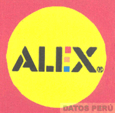 El logotipo de forma cuadrangular y fondo color rojo conteniendo una figura circular color amarillo apreciándose la denominación ALEX escrita en letras características en los colores negro, rojo, anaranjado y celeste; conforme al modelo adjunto