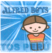 El logotipo conformado por la denominación ALFRED BOYS escrita en letras características en color azul, la representación estilizada de un niño en la combinación de colores azul, amarillo, marrón y anaranjado, apreciándose como fondo franjas color celeste y blanco; conforme al modelo adjunto.