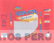 La etiqueta conformada por la denominación ALIANZA escrita en letras características y en la parte inferior de ésta se aprecia la frase TRIGOS DE ORO, la figura de una espiga de trigo, un huevo y otro partido en la mitad, todo dentro de una figura irregular; en cada lado se observa la misma denominación con la espiga y el huevo partido en la mitad; asimismo se aprecian unas frases alusivas al producto; todo en los colores blanco, azul, rojo y dos tonalidades de amarillo; conforme al modelo adjunto