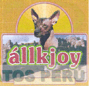EL LOGOTIPO CONSTITUIDO POR LA DENOMINACIÓN ÁLLKJOY ESCRITA EN LETRAS CARACTERÍSTICAS Y LA FIGURA ESTILIZADA DE UN PERRO PERUANO SOBRE UN FONDO ESTILIZADO DEL SOL Y RUINAS INCAICAS, EN LOS COLORES CELESTE, VERDE CLARO, VERDE OSCURO, MARRÓN CLARO, MARRÓN OSCURO, AMARILLO, ROSADO, ROJO, CREMA Y MOSTAZA; CONFORME AL MODELO ADJUNTO