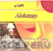 El logotipo conformado por un cuadrado con tres divisiones, en cuyo extremo superior derecho se observa una figura irregular que contiene dos círculos concéntricos en cuyo interior se encuentra el diseño de una flor; en la primera franja se encuentra una palabra escrita en idioma árabe; en la segunda franja, se observa la denominación ALOKOZAY escrita en letras características; en la tercera división y al lado izquierdo se aprecia una biblioteca, con libros, una lámpara encendida y una vajilla con el té servido, al lado derecho se aprecia la frase en idioma inglés CELEBRATE THE MOMENT; todo en la combinación de colores amarillo, anaranjado, rojo, blanco y marrón; conforme al modelo adjunto