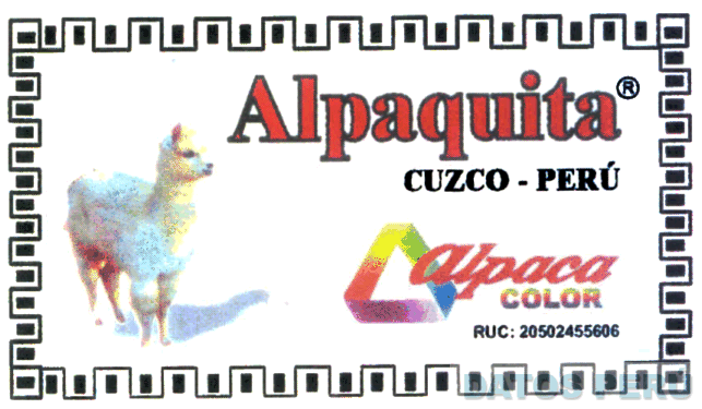 El logotipo conformado por la denominación ALPAQUITA CUZCO-PERU ALPACA COLOR, la cual no se reivindica, escrita en letras características y la figura estilizada de una alpaca seguida de una figura triangular; todo dentro de una rectángulo con borde tipo ladrillo en los colores negro, blanco, rojo, violeta, azul, amarillo y verde; conforme al modelo adjunto