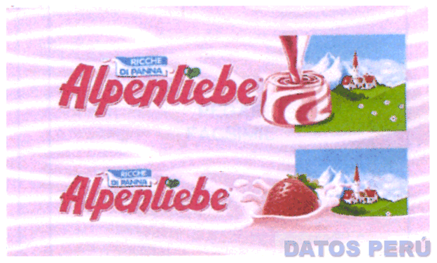 LA DENOMINACION ALPENLIEBE, EN LETRAS CARACTERISTICAS, EN LA PARTE SUPERIOR DE LA DENOMINACION, LA FRASE RICCHE DI PANNA, Y EL DISEÑO DE UN CONFITE, UNA FRESA Y DOS PAISAJES RURALES, TODO EN LOS COLORES FUCSIA, ROJO, BLANCO, LILA, VERDE, AZUL Y NEGRO, CONFORME AL MODELO ADJUNTO