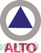 El logotipo conformado por la figura de un triángulo equilátero en color azul dentro de un círculo de color plomo, todo sobre la denominación ALTO escrita en letras características de color rojo; conforme al modelo adjunto