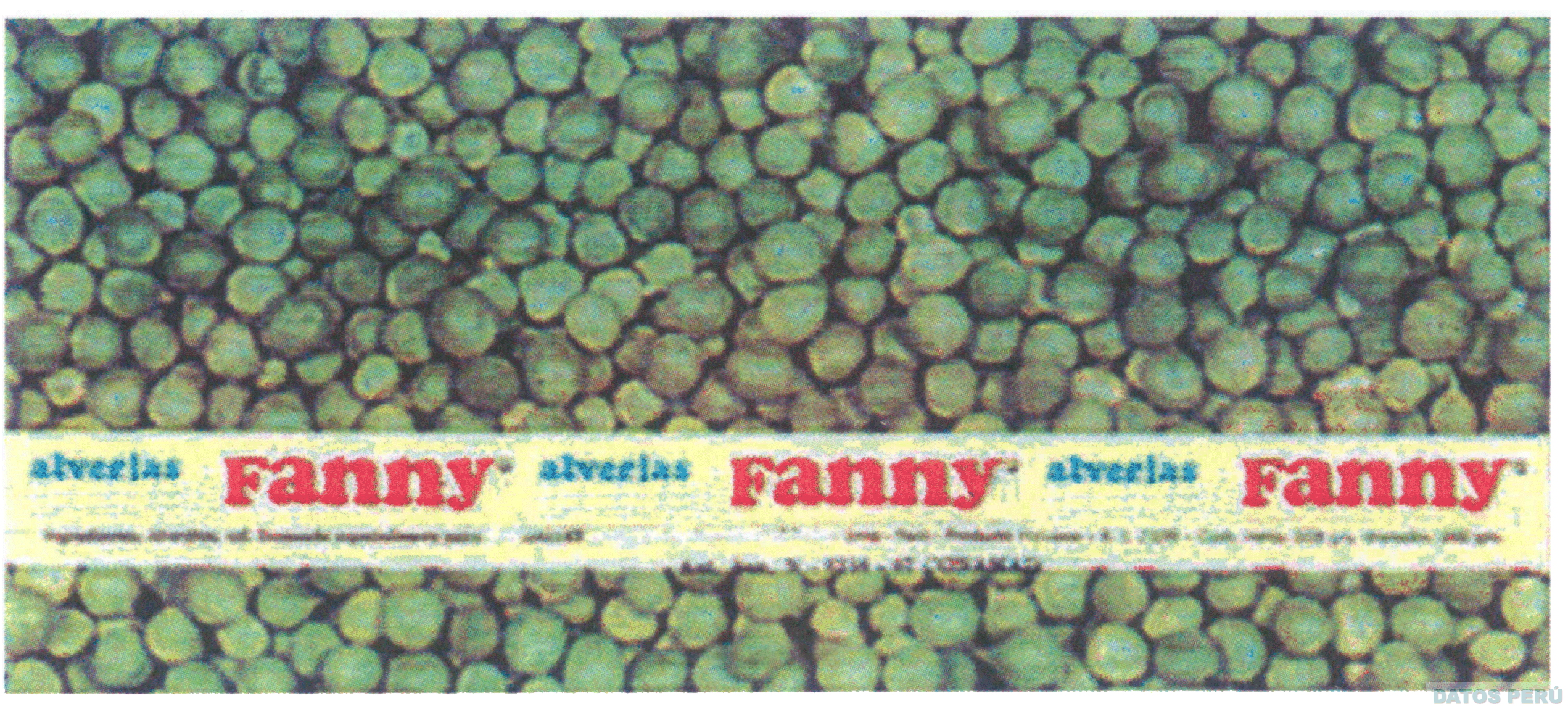 La denominación ALVERJAS FANNY escrita en letras características en forma repetida dentro de una franja, sobrepuesta a un fondo representado por alverjas, todo en la combinación de colores verde, rojo, amarillo y turquesa; conforme al modelo adjunto