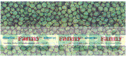 La denominación ALVERJAS FANNY escrita en letras características en forma repetida dentro de una franja, sobrepuesta a un fondo representado por alverjas, todo en la combinación de colores verde, rojo, amarillo y turquesa; conforme al modelo adjunto