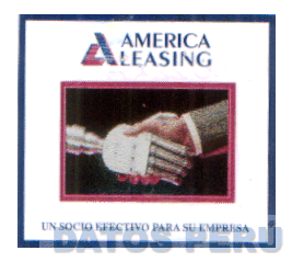 LA DENOMINACION AMERICA LEASING, EL LOGOTIPO ESTA CONFORMADO POR UNA MANO METALICA ESTRECHANDO LA MANO DE UN HOMBRE DENTRO DE UN RECUADRO. ARRIBA DEL RECUADRO EL NOMBRE AMERICA LEASING EN COLOR AZUL Y DEBAJO DEL RECUADRO LA FRASE UN SOCIO EFECTIVO PARA SU EMPRESA,