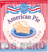 El diseño estilizado de una porción de pastel de color beige sobre un plato de color celeste y azul, dentro de un círculo con pequeñas fintas, apreciándose en la parte superior la denominación AMERICAN PIE (sin reivindicar) escrita en letras características de color celeste y borde rojo y una cinta estilizada de color celeste, blanco y rojo y demás figuras alusivas al producto; todo lo cual se encuentra sobre un cuadrado de base color celeste y líneas verticales rojas y blancas; conforme al modelo adjunto
