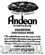 La etiqueta conteniendo la denominación ANDEAN VINEYARDS con su escritura característica y una figura oval con un paisaje campestre estilizado, en la parte inferior se aprecian palabras alusivas al producto; conforme al modelo adjunto