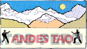 El logotipo conformado por la denominación ANDES TAO escrita en letras características de color rojo y a los lados la silueta de dos hombres en posición de kung fu, sobre una franja de color amarillo; en la parte superior la representación estilizada de un paisaje de nevados con el sol, en los colores celeste, verde, anaranjado, blanco, gris y amarillo; todo dentro de una figura de cuatro lados y de borde irregular de color negro; conforme al modelo adjunto