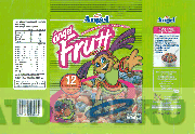 La envoltura rectangular de fondo color verde conteniendo la denominación ANGEL FRUTT escrita en letras características en los colores blanco y rosado, la representación caricaturesca de una niña con aureola en colores marrón claro, blanco, morado, rojo, verde, gris, rosado, negro y celeste, la denominación ANGEL escrita en letras características en los colores azul y blanco con una aureola anaranjada, un tazón de borde rosado conteniendo hojuelas en los colores rojo, celeste, anaranjado, verde y morado, la representación de frutas como uvas, manzana, naranja, cerezas y plátano en los colores morado, rojo, anaranjado, amarillo, blanco y negro con hojas color verde y negro y demás figuras alusivas al producto en los colores negro, anaranjado, blanco y azul; conforme al modelo adjunto