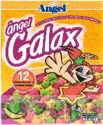 El logotipo conformado por la denominación ANGEL GALAX escrita en letras características, así como la representación caricaturizada de una niña con aureola, asimismo se aprecia una figura circular y una franja ondulada las cuales contienen frases alusivas al producto (sin reivindicar dichas frases); en la parte superior del logotipo, se aprecia la denominación ANGEL escrita en letras y forma características con una aureola entre las letras N y G así como el símbolo R dentro de un círculo (sin reivindicar) y una línea recta; en la parte inferior del logotipo se aprecia un fondo de cereales así como la representación de un plátano, una manzana y una fresa; todo en la combinación de colores blanco, azul, morado, negro, anaranjado, amarillo, rosado, rojo y verde; conforme al modelo adjunto