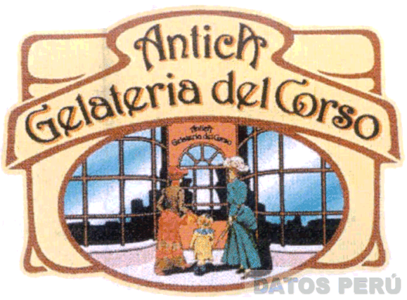 EL LOGOTIPO CONFORMADO POR LA DENOMINACION ANTICA GELATERIA DEL CORSO ESCRITA EN LETRAS CARACTERISTICAS DENTRO DE UNA BANDEROLA, EN LA PARTE INFERIOR DENTRO DE UNA FIGURA OVOIDE LAS FIGURAS ESTILIZADAS DE DOS MUJERES Y UN NIÑO FRENTE A UN EDIFICIO EN CUYO INGRESO SE REPITE LA DENOMINACION ANTICA GELATERIA DEL CORSO; TODO EN LOS COLORES AMARILLO, MARRON, AZUL, BLANCO, VERDE, ANARANJADO Y NEGRO, CONFORME AL MODELO