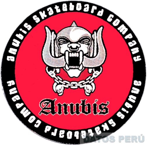 El logotipo conformado por la denominación ANUBIS SKATEBOARD COMPANY escrita en letras características y la representación estilizada de la cabeza de un demonio con casco de gladiador atado con cadenas y dos calaveras colgadas, todo dentro de un doble círculo en los colores rojo, negro, plomo y blanco; conforme al modelo adjunto