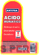 La etiqueta conformada por la figura estilizada en forma de bota de fondo color rojo y borde amarillo; dentro de la cual se aprecia en la parte superior un rectángulo de fondo color azul con la denominación ANYPSA escrita en letras características de color blanco, debajo la denominación ACIDO MURIATICO, DESTRUYE EL SARRO, DESMANCHA, DESINFECTA en letras de color blanco; y una figura de forma rectangular de fondo blanco en cuya parte central se aprecia la figura de una calavera y huesos humanos entrecruzados con la palabra PELIGRO; conforme al modelo adjunto
