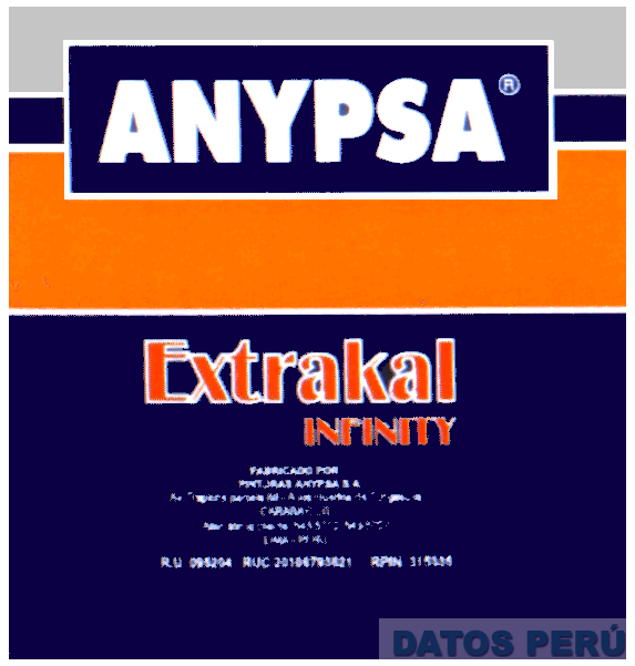 LA ETIQUETA CONFORMADA POR UNA FIGURA CUADRANGULAR DE CUATRO ESPACIOS. EL PRIMERO HORIZONTAL DE COLOR PLATA. EL SEGUNDO HORIZONTAL DE COLOR AZUL. EL TERCERO DE COLOR ANARANJADO. AL CENTRO DE ESTOS ESPACIOS Y DENTRO DE UNA FIGURA RECTANGULAR DE FONDO AZUL, LA DENOMINACION ANYPSA CON LETRAS ESTILIZADAS DE COLOR BLANCO. EN EL CUARTO ESPACIO INFERIOR DE FONDO AZUL OSCURO SE ENCUENTRA LA DENOMINACION EXTRAKAL INFINITY CON LETRAS ESTILIZADAS DE COLOR ROJO SOMBREADAS DE BLANCO, CONFORME MODELO ADJUNTO