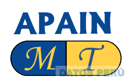 El logotipo conformado por la denominación APAIN escrita en letras características, y la representación estilizada de una cápsula con las letras M T, en los colores azul, amarillo y negro; conforme al modelo adjunto