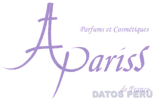 La denominación APARISS PARFUMS ET COSMÉTIQUES DE FRANCE escrita en letras características de color lila, donde la letra A se aprecia con dos líneas ondulantes; conforme al modelo adjunto