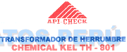 El logotipo conformado por la figura de un triángulo de color rojo con líneas diagonales de color blanco y la denominación API-CHECK escrita en letras características en color rojo; debajo se aprecia la frase TRANSFORMADOR DE HERRUMBRE CHEMICAL KEL TH- 801 escrita en letras características en los colores rojo y azul; conforme al modelo adjunto