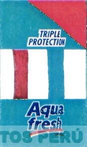 La etiqueta que contiene la denominación AQUAFRESH, TRIPLE PROTECTION, en la combinación de colores azul, verde, rojo y blanco, conforme al modelo adjunto