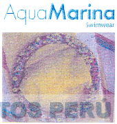 El logotipo conformado por la denominación AQUAMARINA SWIMWEAR escrita en letras características y una figura circular con adornos en el área frontal, en la combinación de colores turquesa verdemar, amarillo y lila; conforme al modelo adjunto