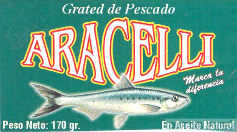 El logotipo conformado por la denominación ARACELLI escrita en letras características en forma decreciente en los extremos y creciente al centro en color blanco con bordes rojo y amarillo, sobre ella las palabras GRATED DE PESCADO, en la parte inferior, la figura estilizada de un pescado sardina de colores blanco y plateado, con puntos negros y sombras de color verde, debajo información sobre el producto en letras de color blanco; conforme al modelo adjunto