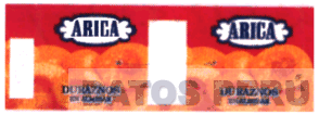 La etiqueta rectangular donde hay figuras de duraznos en mitades a lo largo y en la parte superior dentro de una elipse con curvas de fantasía la denominación ARICA, en colores rojo, azul, amarillo y blanco, conforme al facsimil