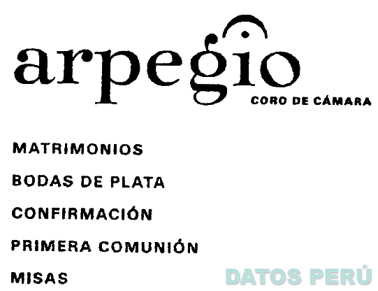 El logotipo conformado por la denominación ARPEGIO y la frase CORO DE CÁMARA, ambas escritas en letras características, donde sobre la letra I se aprecia la figura estilizada de una media luna; asimismo en la parte inferior se aprecian las denominaciones MATRIMONIOS, BODAS DE PLATA, CONFIRMACIÓN, PRIMERA COMUNIÓN y MISAS (sin reivindicar); conforme al modelo adjunto