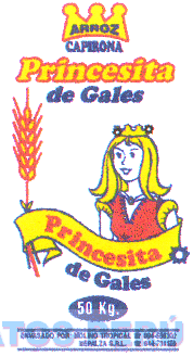 LA FIGURA DE UNA CORONA EN EL CENTRO SUPERIOR Y LA DENOMINACION ARROZ CAPIRONA, PRINCESITA DE GALES; ESCRITA EN LETRAS CARACTERISTICAS; AL LADO IZQUIERDO LA FIGURA DE MEDIO CUERPO DE UNA MUJER Y AL CENTRO UNA FRANJA CON LA DENOMINACION PRINCESITA DE GALES; TODO EN LA COMBINACION DE COLORES ROJO, AMARILLO Y AZUL; CONFORME AL MODELO ADJUNTO,