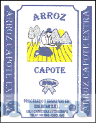 La denominación ARROZ escrita en letras características debajo de la cual se aprecia la representación de un campesino cosechando arroz delante de dos árboles y tres cerros sentado en una chacra; debajo de todo la denominación CAPOTE y la figura irregular en cuyo interior se aprecia la palabra EL MEJOR a los costados se aprecian dos franjas con la denominación ARROZ CAPOTE EXTRA, todo en los colores azul, plomo y amarillo; conforme al modelo adjunto