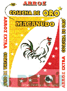 El logotipo conformado por la denominación MACANUDO escrita en letras características y figura de un gallo y espiga de arroz estilizada y la frase COSECHA DE ORO escrita en letras características y estrellas en la parte superior e inferior, todo en los colores amarillo, rojo, negro y verde; conforme al modelo adjunto