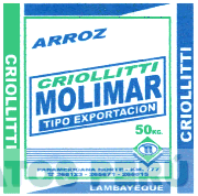 La denominación ARROZ debajo de la cual se aprecia una figura rectangular en cuyo interior aparece la denominación CRIOLLITTI MOLIMAR TIPO EXPORTACION; debajo la figura de un rombo con dos círculos en su interior y la letra N sobrepuesta a siete líneas horizontales; todo ello encerrado dentro de un rectángulo a cuyos lado izquierdo y derecho se aprecia una línea gruesa vertical conteniendo la denominación CRIOLLITI, todo en los colores verde, azul y blanco; conforme al modelo adjunto.