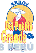 El logotipo conformado por la denominación DEL PUEBLO GRANDE escrita en letras características en cuyo fondo se aprecia la imagen de un campesino sosteniendo una lampa, que viste con sombrero, camisa y pantalones cortos; asimismo, detrás de dicha imagen se observa una figura irregular y en la parte superior la palabra ARROZ; todo en la combinación de colores rojo, azul y amarillo; conforme al modelo adjunto