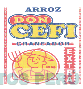 El logotipo conformado por la denominación ARROZ DON CEFI escrita en letras características, donde la palabra DON se encuentra sobrepuesta a una figura irregular redondeada, debajo se aprecia la denominación GRANEADOR cruzada por dos líneas paralelas horizontales, la figura de un hombre con un tenedor y la denominación EXTRA encerrada dentro de una figura irregular dentada; a los costados se aprecia dos líneas verticales conteniendo la denominación DON CEFI en forma repetida, todo en los colores azul, rojo, amarillo y blanco; conforme al modelo adjunto