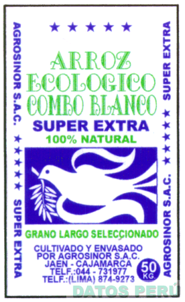EL LOGOTIPO DE FORMA RECTANGULAR CON LA DENOMINACION ARROZ ECOLOGICO COMBO BLANCO ESCRITA EN LETRAS CARACTERISTICAS, EN LA PARTE CENTRAL UN RECUADRO CON LA FIGURA CARACTERISTICA DE UNA PALOMA CON LAS ALAS DESPLEGADAS Y UNA ESPIGA DE ARROZ EN EL PICO; TODO EN LA COMBINACION DE COLORES AZUL, BLANCO Y VERDE; CONFORME AL MODELO ADJUNTO,