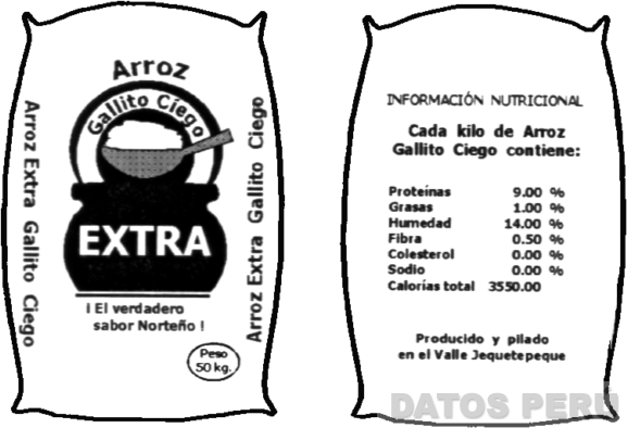 LA FIGURA ESTILIZADA DE UN SACO, EN CUYA PARTE CENTRAL SUPERIOR APARECE LA PALABRA ARROZ Y DENTRO DE UN SEMI-CIRCULO SE APRECIA LA FRASE GALLITO CIEGO; AL CENTRO LA FIGURA DE UNA CUCHARA SIMULANDO CONTENER ARROZ, SOBRE EL CONTORNO DE UNA OLLA CONTENIENDO LA PALABRA EXTRA; EN LA PARTE INFERIOR LA FRASE ¡EL VERDADERO SABOR NORTEÑO! Y A LOS COSTADOS DEL SACO ¡ARROZ EXTRA GALLITO CIEGO!, AL EXTREMO DERECHO SE APRECIA EL REVERSO DE LA FIGURA ESTILIZADA DEL SACO EN LA QUE SE APRECIA LEYENDAS ALUSIVAS AL PRODUCTO; CONFORME AL MODELO ADJUNTO