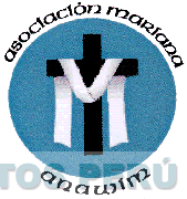 El logotipo conformado por la denominación ASOCIACIÓN MARIANA ANAWIM escrita en letras características minúsculas de color negro, dispuestas en la parte superior e inferior de una figura circular de fondo color turquesa, dentro de la cual se aprecia la figura estilizada de una cruz de color negro y entrelazada la figura de un sudario formando la letra M de color blanco; conforme al modelo adjunto
