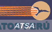 El logotipo rectangular de fondo azul, en cuya parte superior se aprecia una franja de color anaranjado y un círculo de fondo beige dentro del cual se aprecia la figura estilizada de un ave en color azul; en la parte inferior se encuentra la denominación ATSA, en color blanco; conforme al modelo