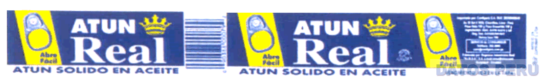 LA ETIQUETA RECTANGULAR DE COLOR AZUL, EN CUYO INTERIOR APARECE LA DENOMINACION ATUN REAL ESCRITA EN LETRAS CARACTERISTICAS EN COLOR BLANCO, SOBRE LA LETRA L APARECE LA FIGURA DE UNA CORONA DE COLOR AMARILLO, AL LADO IZQUIERDO DE LA ETIQUETA APARECE UNA FRANJA VERTICAL OBLICUA DE COLOR AMARILLO, LA MISMA QUE CONTIENE LA FIGURA DE UN ABRIDOR DE COLOR PLOMO Y DEBAJO DE ELLA LA DENOMINACION ABRE FACIL EN COLOR AZUL, DEBAJO APARECE LA DENOMINACION ATUN SOLIDO EN ACEITE ESCRITA EN LETRAS CARACTERISTICAS EN COLOR AZUL, Y SOBRE UN FONDO BLANCO, ESTA DESCRIPCION SE VUELVE A REPETIR AL LADO DERECHO; CONFORME AL MODELO ADJUNTO