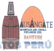 La figura de un barril de color marrón con franjas negras, en la parte superior se aprecia un balde en forma de cabeza de color plomo, al lado derecho se aprecia un semi círculo que asemeja un sol de color anaranjado en la parte inferior se aprecia tres figuras triangulares que asemejan cerros de color azul, marrón y verde con picos de color blanco, estos cerros se puede apreciar la letra (A) y distinguir la denominación AUSANGATE escrita en letras características de color azul, en la parte inferior se aprecia la denominación MOUNTAIN AND JUNGLE EXPLORERS escrita en letras características de color azul en la parte inferior de tal denominación se puede apreciar la denominación HAVITUSH escrita en letras características en color marrón y en la parte inferior de esta última se aprecia la palabra TOUR OPERATOR escrita en letras características de color azul; conforme al modelo adjunto