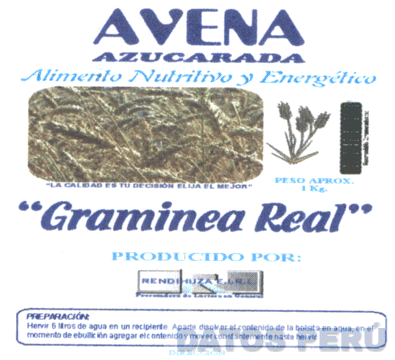 EL LOGOTIPO CON LA DENOMINACION AVENA AZUCARADA ALIMENTO NUTRITIVO Y ENERGETICO GRAMINEA REAL EN LETRAS CARACTERISTICAS DE COLORES AZUL Y CELESTE, EN LA PARTE INFERIOR EL DISEÑO CON LA DENOMINACION RENDIHUZA EIRL EN LETRAS CARACTERISTICAS DE COLOR AZUL SOBREPUESTA A LA LETRA R ESTILIZADA EN COLORES AMARILLO Y VERDE; EN LA PARTE CENTRAL LA FIGURA DE UNAS GRAMINEAS DE COLORES MARRON, AMARILLO Y VERDE; CONFORME AL MODELO ADJUNTO,