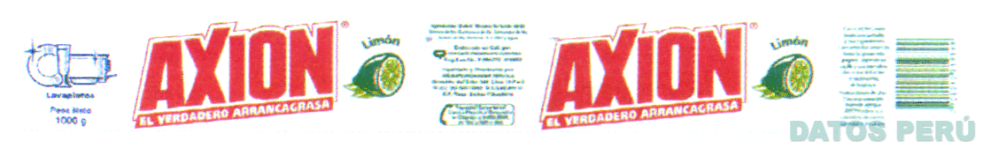 LA DENOMINACION AXION, EN LETRAS CARACTERISTICAS, Y EL DISEÑO DE UN LIMON PARTIDO, TODO DENTRO DE UNA ETIQUETA RECTANGULAR Y EN LOS COLORES ROJO, VERDE, BLANCO, AZUL Y GRIS, CONFORME AL FACSIMIL ADJUNTO